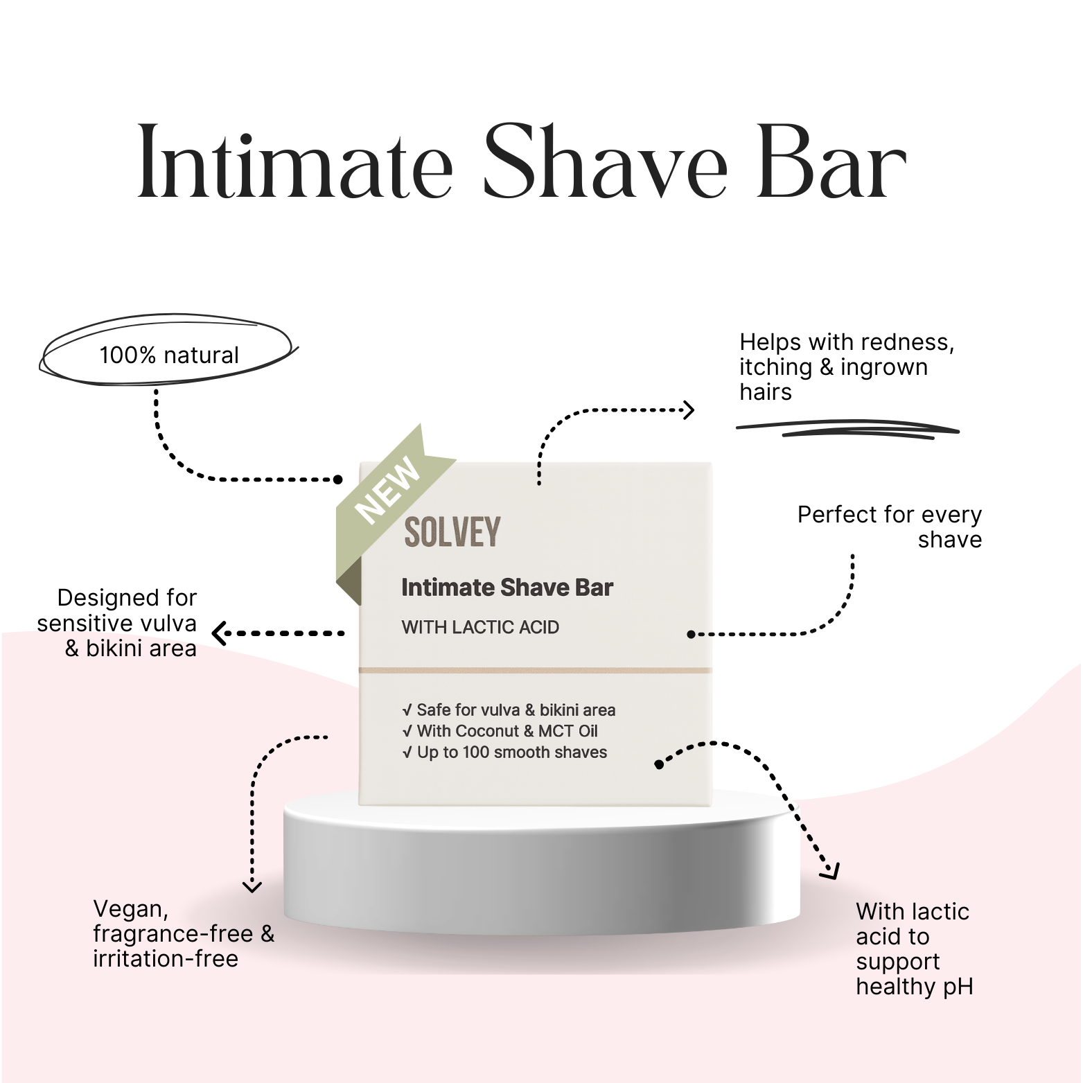 Solvey Intimate Shave Bar er specielt udviklet til kvinder, der ønsker at pleje og barbere deres intime områder på en skånsom, sikker og effektiv måde. Denne pH-balancerede bar renser uden at strippe huden, understøtter det intime mikrobiom og giver en glat, behagelig barbering uden parfume, sæbe eller skrappe irritationsmidler.