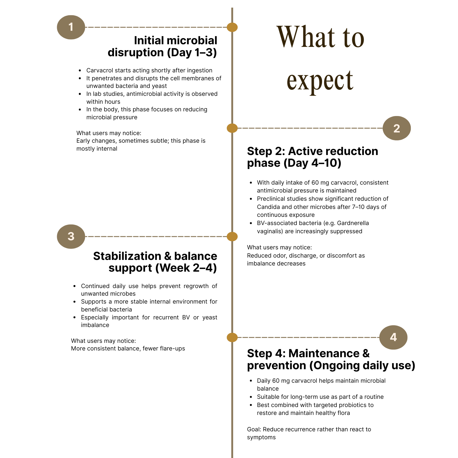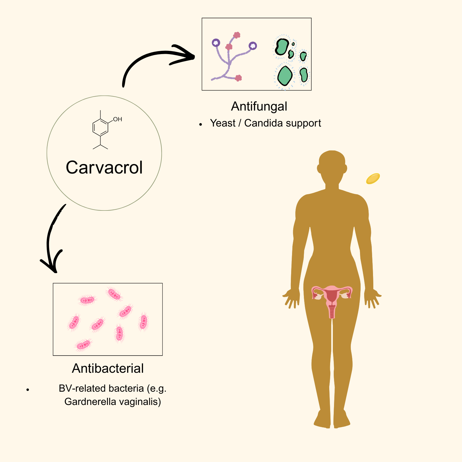 Durch die Verringerung des mikrobiellen Drucks schafft Carvacrol Raum für das Gedeihen nützlicher Bakterien und unterstützt so langfristig das vaginale Gleichgewicht, anstatt nur vorübergehende Linderung zu verschaffen.