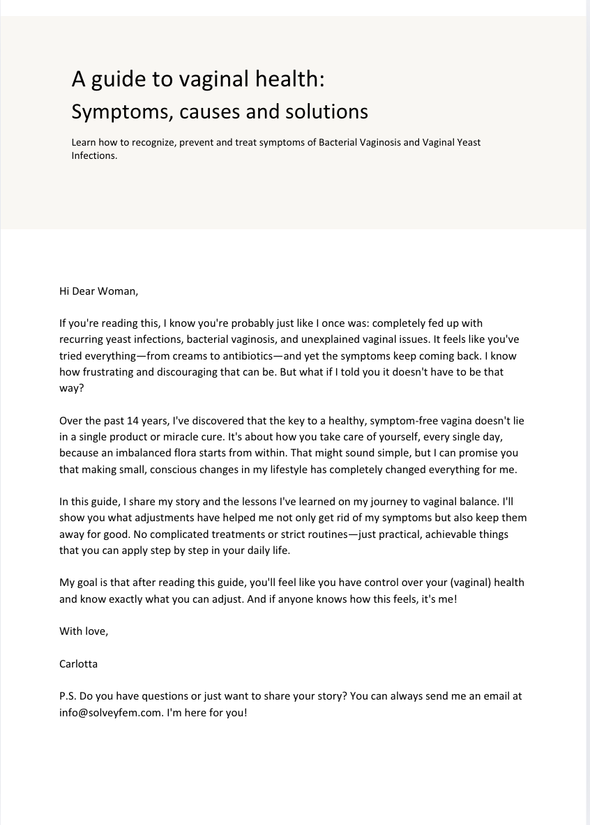 Om je tijd, frustratie en eindeloos zoeken te besparen, heb ik al mijn bevindingen gebundeld in deze gids. In deze gids vind je niet alleen alle kennis die ik in de loop der jaren heb verzameld, maar ook een uitgebreide boodschappenlijst, praktische tips en recepten die je helpen om je vaginale gezondheid op natuurlijke wijze te ondersteunen. Mijn doel is om je te helpen weer controle te krijgen over je eigen lichaam, zonder te vertrouwen op tijdelijke oplossingen.